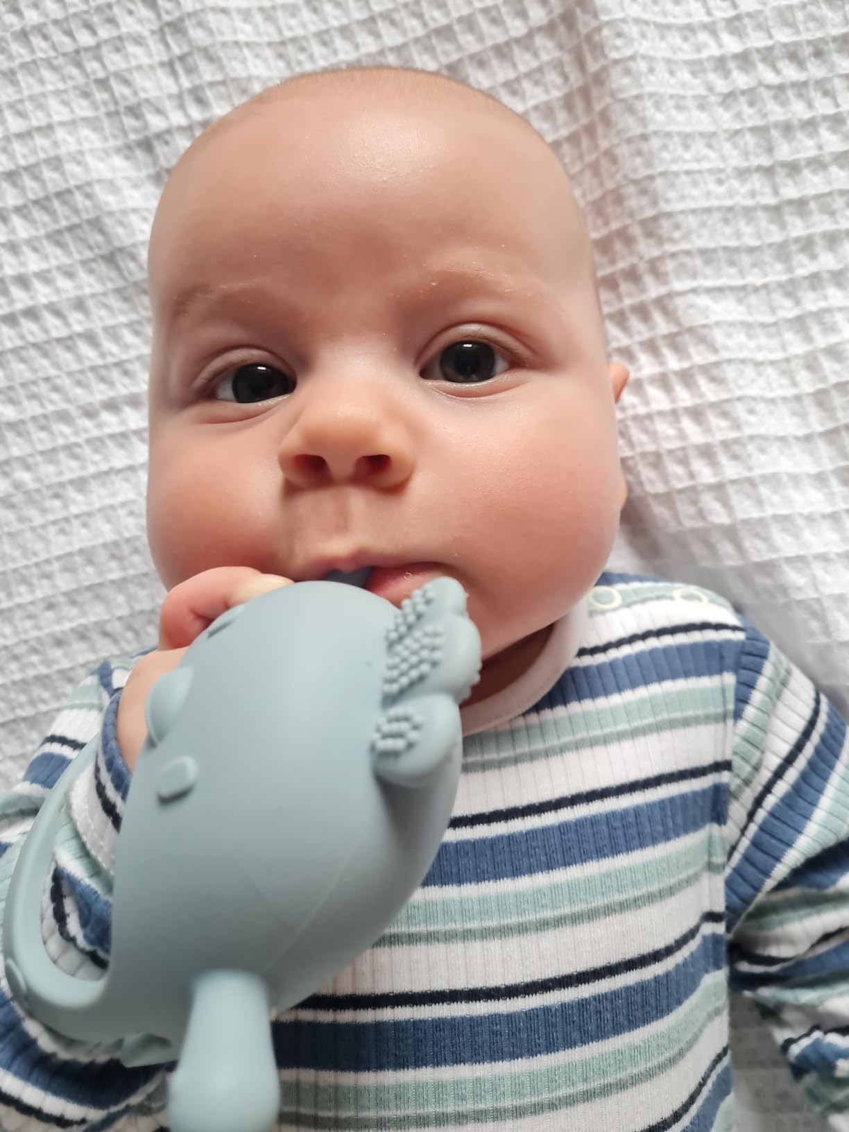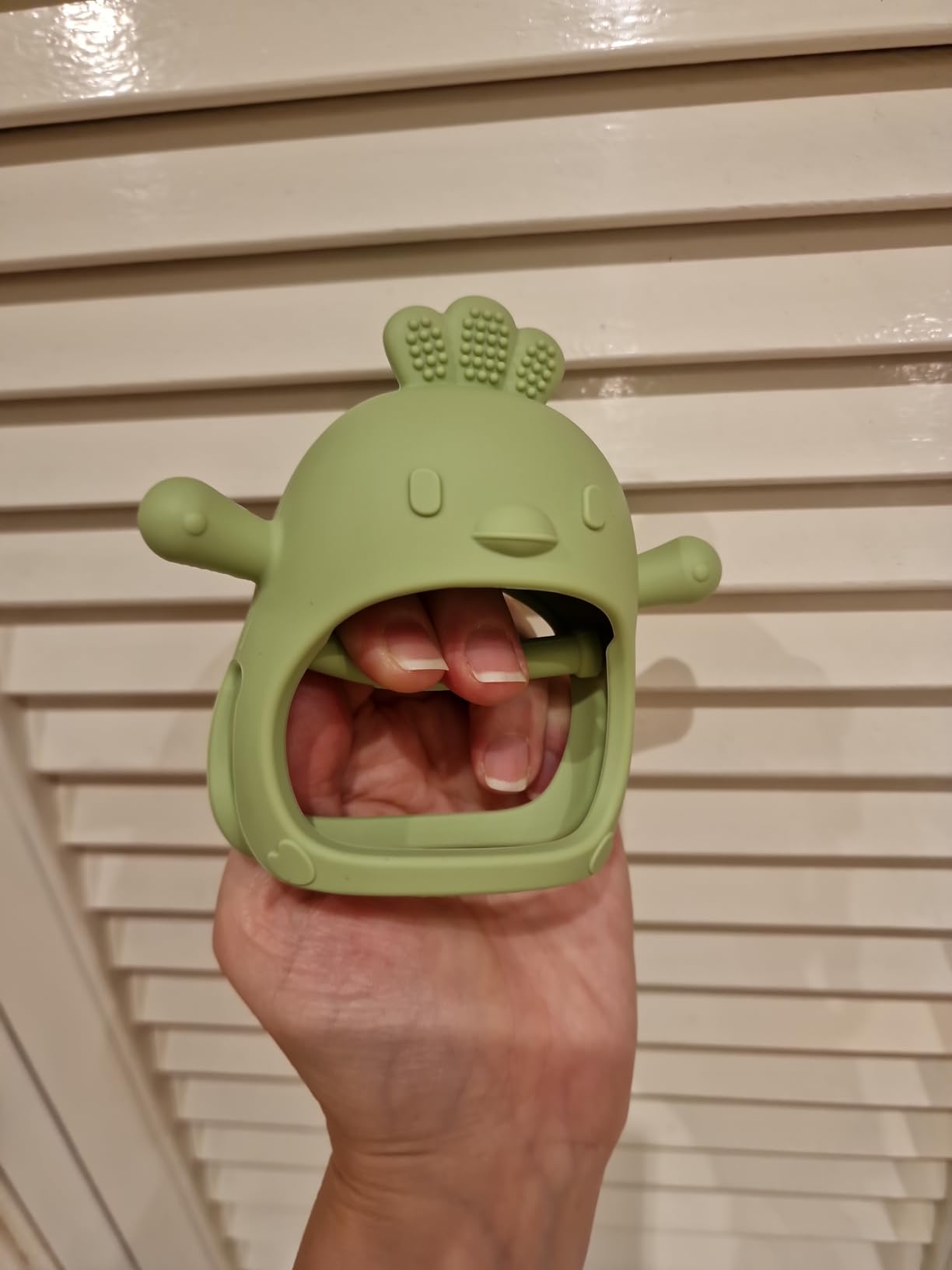 Eindelijk iets dat werkt! Mijn zoontje had zoveel last van zijn tandjes en alles viel steeds op de grond. Deze handschoen blijft in zijn handjes en hij vindt het heerlijk om op te kauwen!